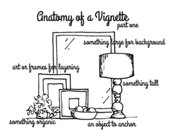 Estos esquemas están por todas partes en Pinterest; hay muchos, y ayudan a comprender la estructura de las vignettes. Siempre aparecen ciertos elementos: algo que ilumine (lámparas, espejos), verde o flores, imágenes enmarcadas, libros o bandejas como soporte, piezas bajas… y, sobre todo, un concepto que lo una todo.