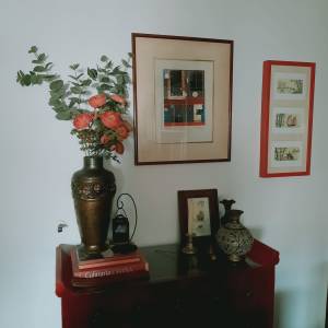 Los jarrones han sido regalos muy queridos, hechos a lo largo del tiempo por unos amigos parsis. Los pequeños cuadros son tarjetas chinas que se usaron como felicitaciones. Y el cuadro de Quintana Castillo, pintor venezolano que siempre me ha gustado, encaja bien con sus colores brillantes y primarios. De todos ellos tengo anécdotas y recuerdos interesantes en las que me extenderé en los Fragmentos de Memoria